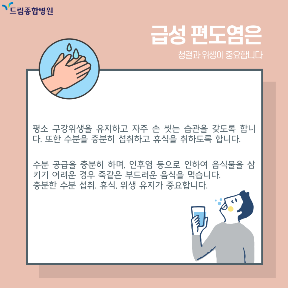 급성 편도염 발생 방지를 위해 평소 구강위생을 유지하고 자주 손 씻는 습관을 갖도록 합니다. 또한 수분을 충분히 섭취하고 휴식을 취하도록 합니다.