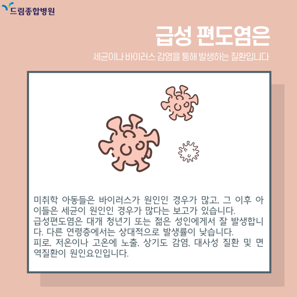 급성편도염은 세균이나 바이러스 감염을 통해 발생하는 질환입니다.