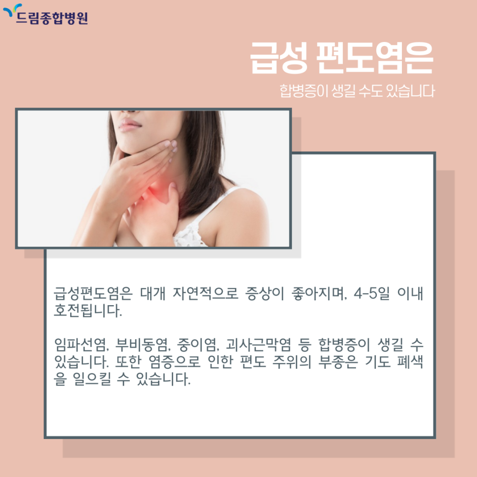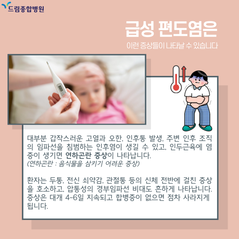 급성편도염은 대부분 갑작스러운 고열과 오한, 인후통 발생, 주변 인후 조직의 임파선을 침범하는 인후염이 생길 수 있고, 인두근육에 염증이 생기면 연하곤란 증상이 나타납니다.
