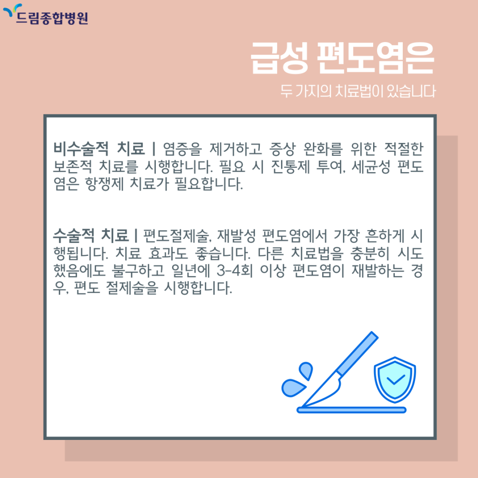 - 비수술적 치료 : 염증을 제거하고 증상 완화를 위한 적절한 보존적 치료를 시행합니다. 필요 시 진통제 투여, 세균성 편도염은 항쟁제 치료가 필요합니다.