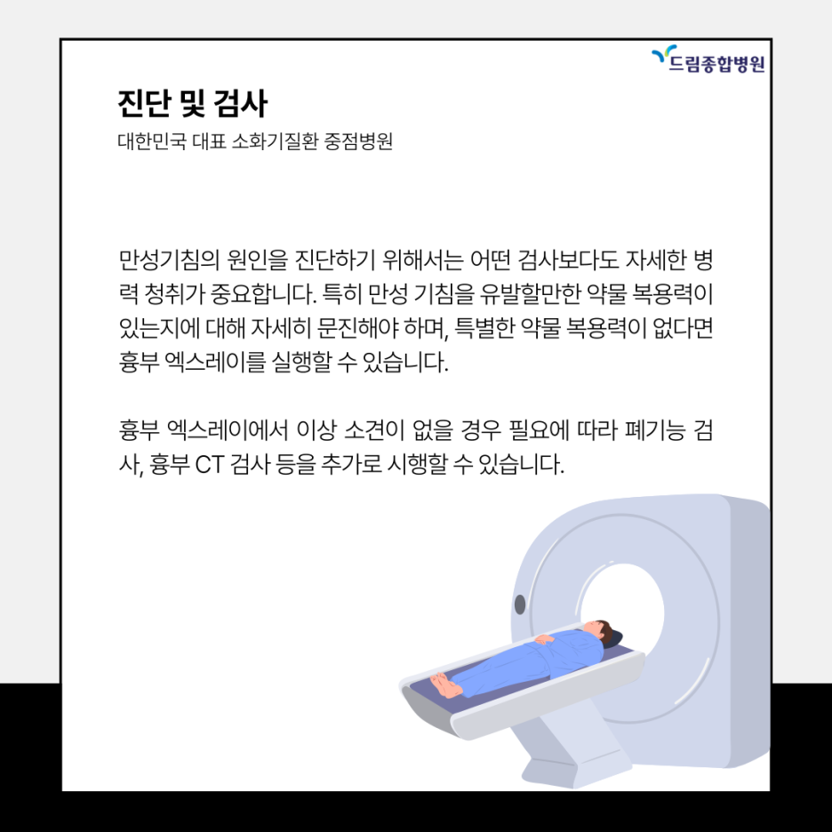 만성기침의 원인을 진단하기 위해서는 어떤 검사보다도 자세한 병력 청취가 중요합니다. 특히 만성 기침을 유발할만한 약물 복용력이 있는지에 대해 자세히 문진해야 하며, 특별한 약물 복용력이 없다면 흉부 엑스레이를 실행할 수 있습니다.